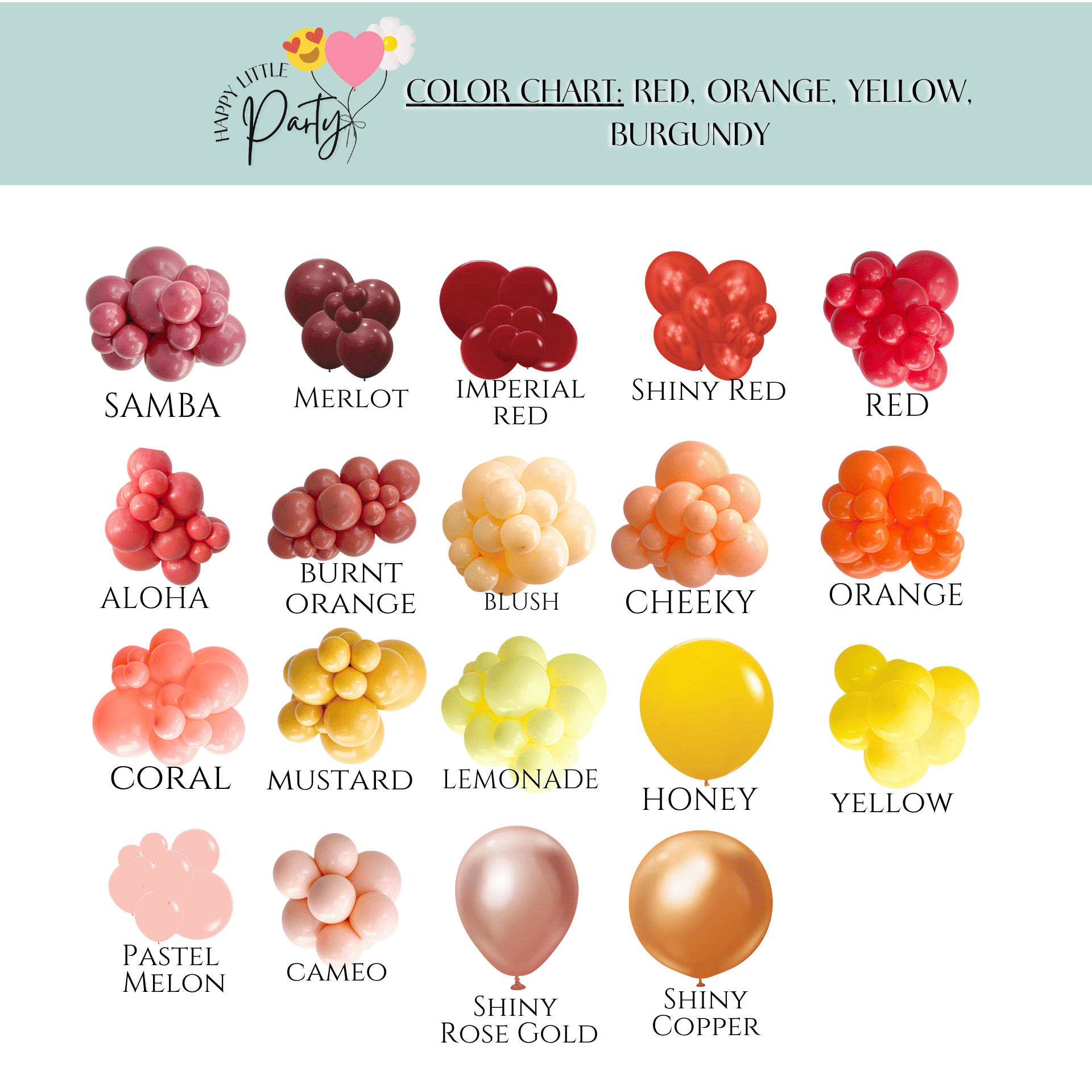 While we could do this in our sleep, and know all the names of everything balloon related, we realize you may only know balloons as the party store helium bouquets. This page is dedicated to all the terminology, color names, and photos of the products we use to assemble the decor we bring to you - so you know what to ask us for when booking your event!