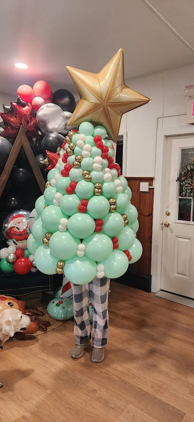 This tree includes more ornaments, balloon “ribbons” and a star burst on top.